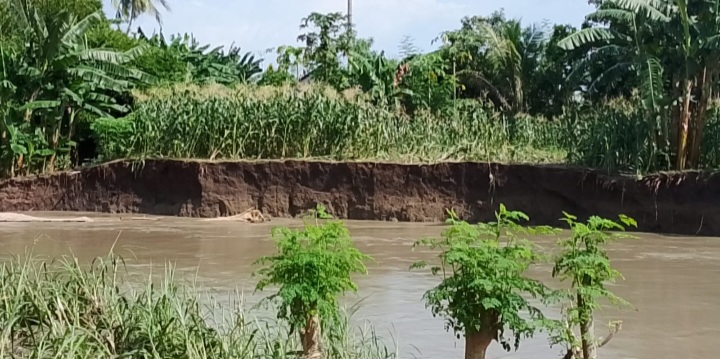 Potret realita yang terjadi di lokasi, jarak antara sungai dan pemukiman warga hanya tinggal beberapa meter saja. Luapan air rupanya mengikis tepi tanah hingga nyaris mendekati pemukiman.